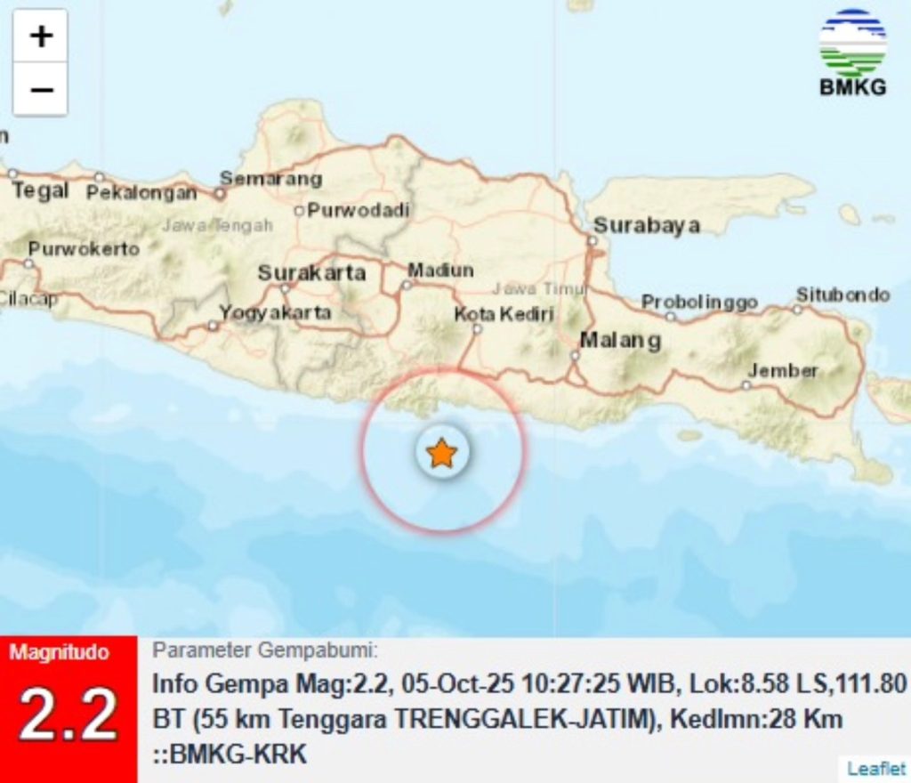 Info Gempa Mag:2.2, 05-Oct-25 10:27:25 WIB, Lok:8.58 LS,111.80 BT (55 km Tenggara TRENGGALEK-JATIM), Kedlmn:28 Km ::BMKG-KRK