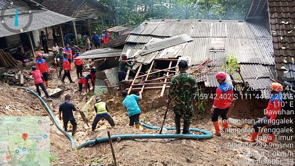 Jumat, 7 November 2025 menjadi hari di mana semangat gotong royong dan kemanusiaan kembali ditegaskan di Kabupaten Trenggalek, khususnya di lokasi yang terdampak bencana tanah longsor pada 1 November lalu di Desa Dawuhan Kecamatan Trenggalek. Material longsoran tebing yang menimbun rumah warga dan mengakibatkan korban jiwa, kini secara masif dibersihkan melalui operasi gabungan yang melibatkan berbagai unsur. BPBD Trenggalek berkolaborasi erat dengan aparat dari TNI dan Polri yang mengerahkan personelnya untuk membantu proses pembersihan. Tak ketinggalan, tim Damkar juga turut serta dengan peralatan yang dimiliki, membantu menyemprot dan membersihkan sisa lumpur. Fokus utama hari itu adalah menyingkirkan sisa-sisa puing dan material tanah yang tebal, memastikan area terdampak kembali bersih dan aman, sekaligus membuka akses yang mungkin masih tertutup. Kerjasama solid ini menunjukkan komitmen pemerintah daerah dan aparat keamanan dalam penanganan pascabencana, bergerak cepat untuk meringankan beban masyarakat.