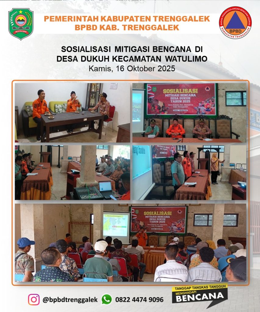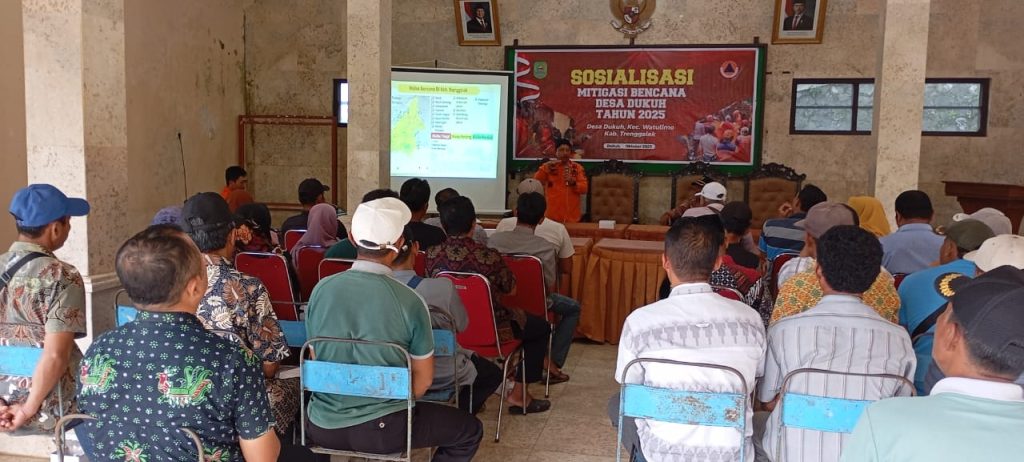BPBD Kabupaten Trenggalek terus menunjukkan komitmennya dalam memperkuat ketahanan masyarakat terhadap ancaman bencana. Pada hari Kamis, 16 Oktober 2025 BPBD Trenggalek sukses melaksanakan kegiatan Sosialisasi Mitigasi Bencana di Desa Dukuh Kecamatan Watulimo. Kegiatan yang diadakan Desa Dukuh ini sangat penting yang bertujuan untuk meningkatkan pemahaman dan kesiapsiagaan warga Desa Dukuh dalam menghadapi potensi bencana yang mungkin terjadi di wilayah mereka. Sebanyak 44 peserta antusias mengikuti sosialisasi ini, yang berasal dari berbagai unsur penting masyarakat, seperti Tokoh Agama, perwakilan RT dan RW, Kepala Dusun, serta anggota masyarakat Desa Dukuh. Kehadiran perwakilan yang beragam ini diharapkan dapat memastikan penyebaran informasi dan pengetahuan mitigasi bencana secara merata dan efektif ke seluruh lapisan masyarakat.
