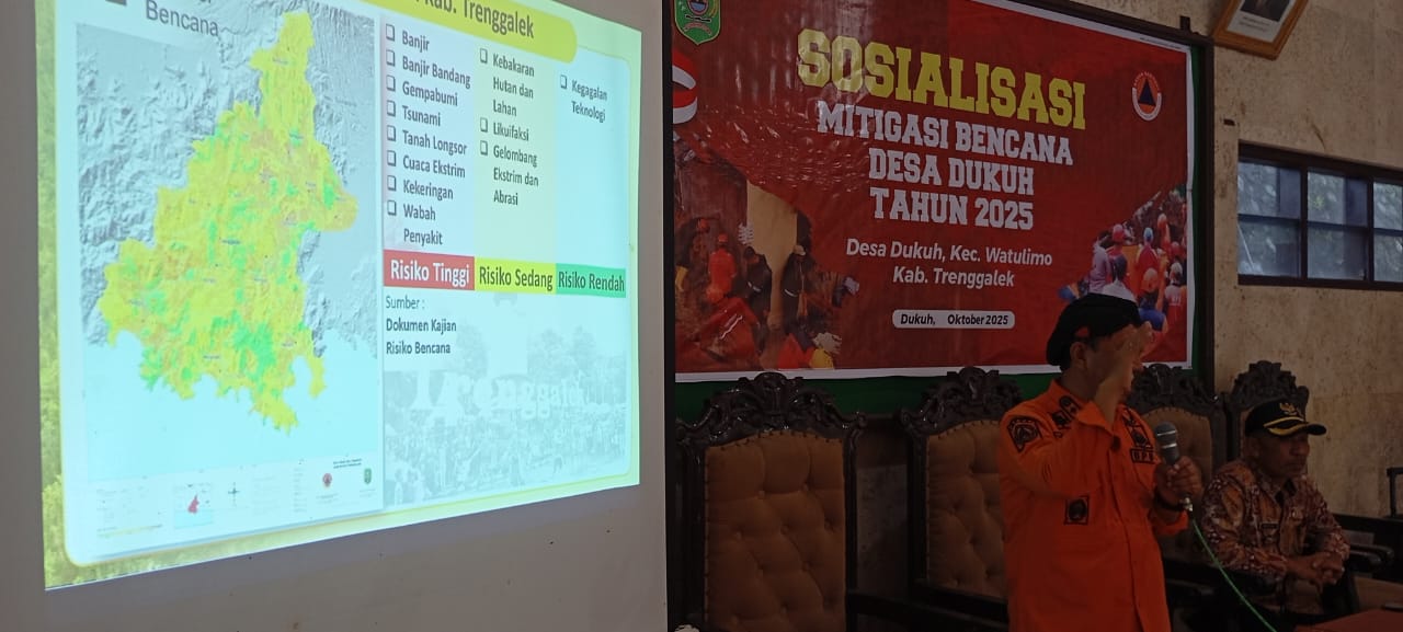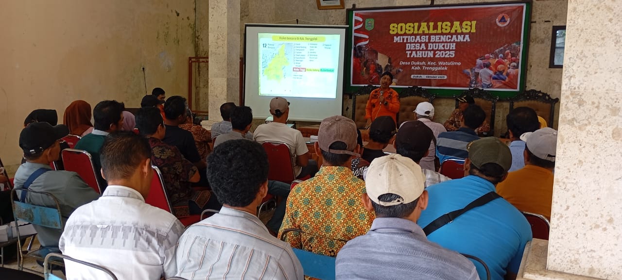 BPBD Kabupaten Trenggalek terus menunjukkan komitmennya dalam memperkuat ketahanan masyarakat terhadap ancaman bencana. Pada hari Kamis, 16 Oktober 2025 BPBD Trenggalek sukses melaksanakan kegiatan Sosialisasi Mitigasi Bencana di Desa Dukuh Kecamatan Watulimo. Kegiatan yang diadakan Desa Dukuh ini sangat penting yang bertujuan untuk meningkatkan pemahaman dan kesiapsiagaan warga Desa Dukuh dalam menghadapi potensi bencana yang mungkin terjadi di wilayah mereka. Sebanyak 44 peserta antusias mengikuti sosialisasi ini, yang berasal dari berbagai unsur penting masyarakat, seperti Tokoh Agama, perwakilan RT dan RW, Kepala Dusun, serta anggota masyarakat Desa Dukuh. Kehadiran perwakilan yang beragam ini diharapkan dapat memastikan penyebaran informasi dan pengetahuan mitigasi bencana secara merata dan efektif ke seluruh lapisan masyarakat.