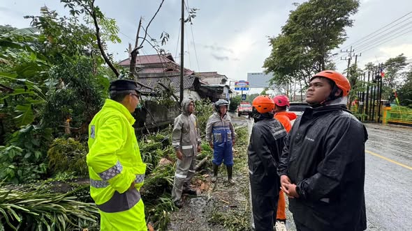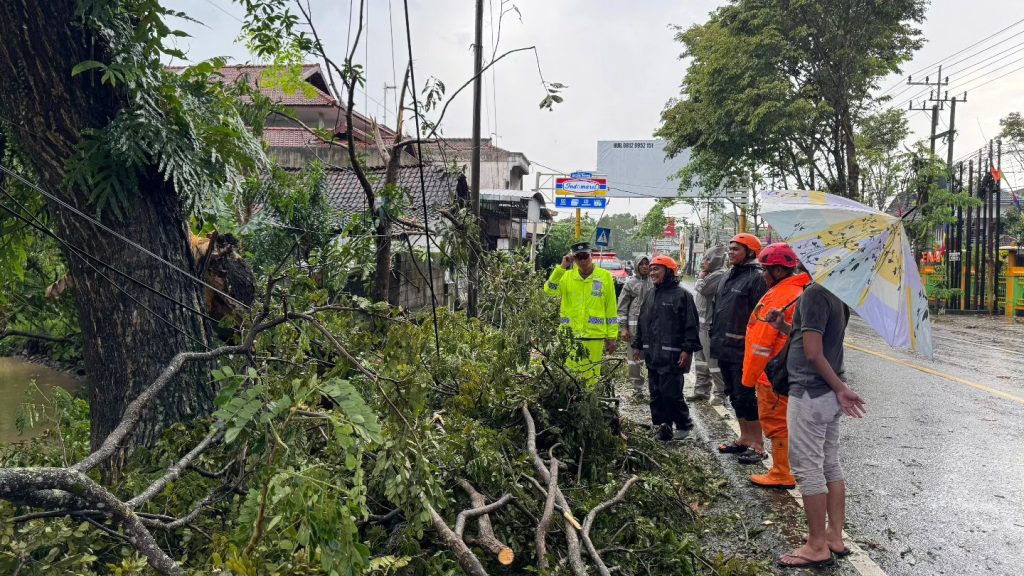 Kamis, 2 April 2026 Pkl. 15.00 WIB terjadi hujan intensitas sedang hingga tinggi disertai angin kencang, sekitar Pkl. 15.45 WIB pohon tumbang berjenis trembesibroboh menutup sebagian badan jalan (Jl. Raya Tulungagung – Trenggalek Desa Durenan Kec. Durenan.