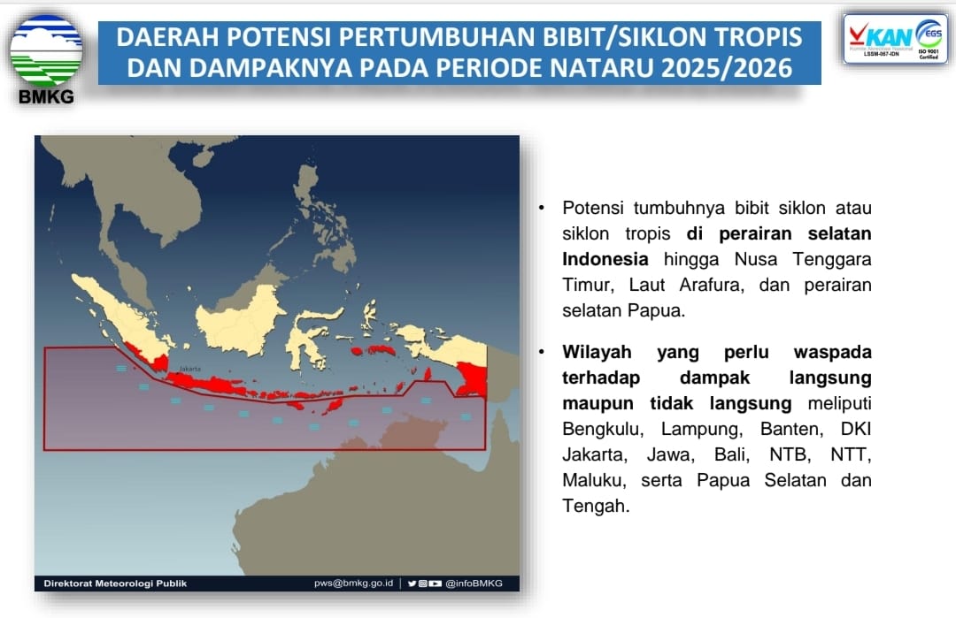 Peta yang menggambarkan daerah-daerah berpotensi pertumbuhan bibit siklon tropis di Indonesia periode 2025-2026 (sumber: BMKG)