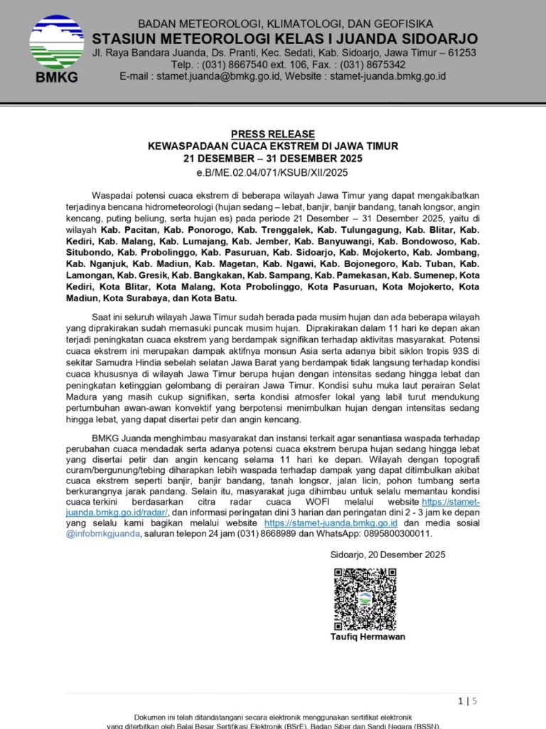 PRESS RELEASE KEWASPADAAN CUACA EKSTREM DI JAWA TIMUR (21 – 31 Desember 2025 )