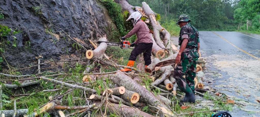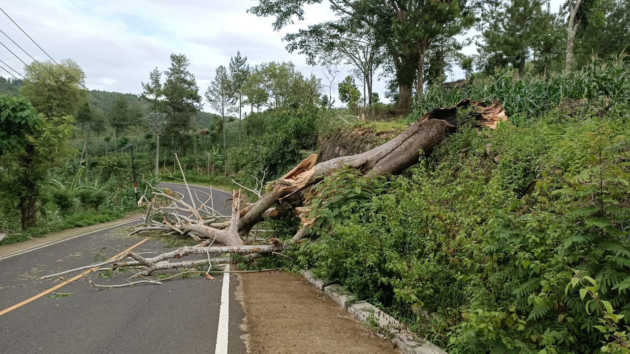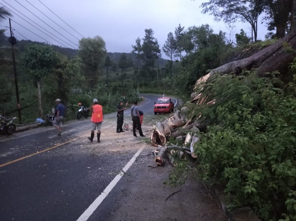 Rabu, 14 Januari 2026 Pukul 15.05 WIB Wilayah Kec. Panggul terjadi hujan deras disertai angin kencang, akibat dari kejadian tersebut Pukul 16.30 WIB terjadi pohon tumbang berjenis sengon buto diameter 1 meter tinggi 20 meter melintang menutup akses jalan Panggul – Pacitan. TRC Multisektor BPBD, TNI, Pos Unit BPBD wilayah Panggul, KRPH Panggul bersama masyarakat mendatangi lokasi kejadian dan melakukan giat pembersihan material pohon tumbang, sekira pukul 18.45 WIB pembersihan pohon tumbang selesai akses jalan kembali lancar.