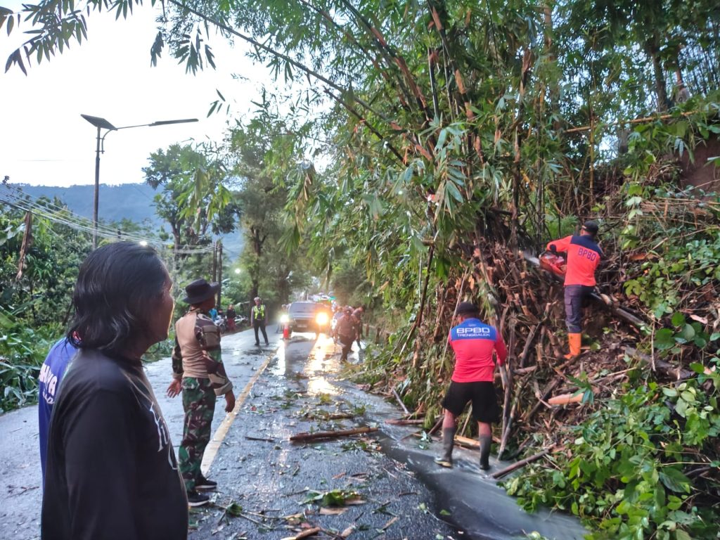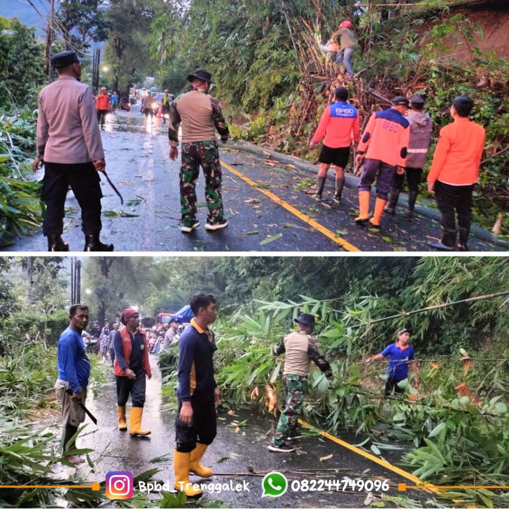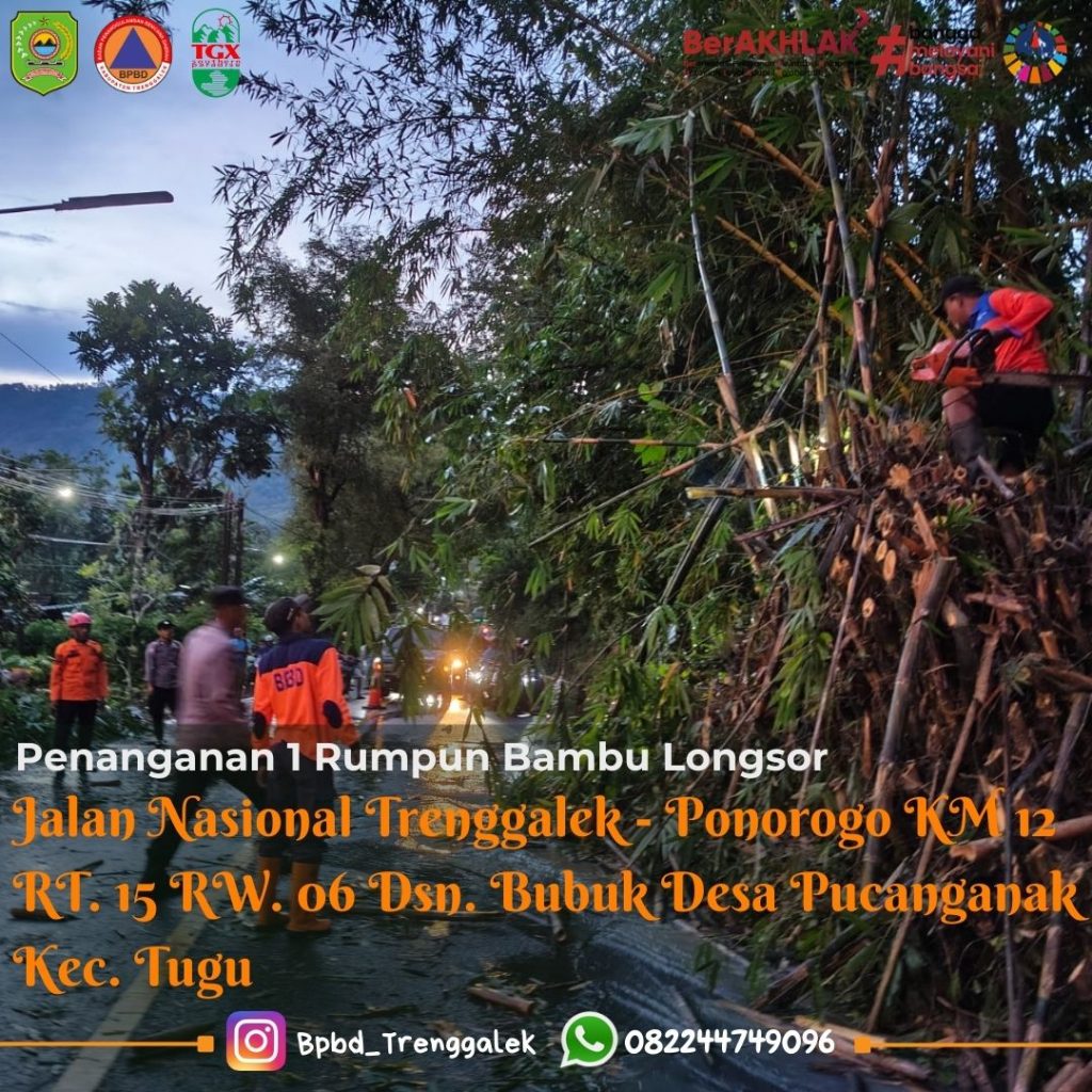 Sabtu, 17 Januari 2026 mulai pukul 15.30 – 17.00 WIB Wilayah Kec. Tugu diguyur hujan dengan intensitas sedang – tinggi, akibat dari kejadian tersebut pada pukul 16.45 WIB satu dapur rumpun bambu longsor dengan tinggi tebing 6 m dan lebar 10 m mengakibatkan sebagian badan Jalan Nasional Trenggalek – Ponorogo KM 12 RT. 15 RW. 06 Dsn. Bubuk Desa Pucanganak Kec. Tugu kab. Trenggalek tertimbun material longsor. BPBD Trenggalek, TRC-PB Multisektor BPBD, TNI, Polri, Perangkat Desa Pucanganak bersama masyarakat mendatangi lokasi kejadian dan melakukan giat pembersihan material bambu tumbang, sekitar pukul 18.25 WIB pembersihan bambu tumbang selesai arus lalulintas kembali lancar.
