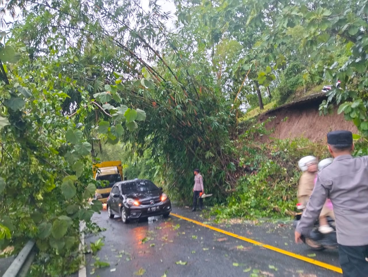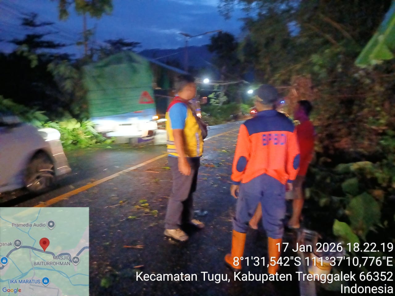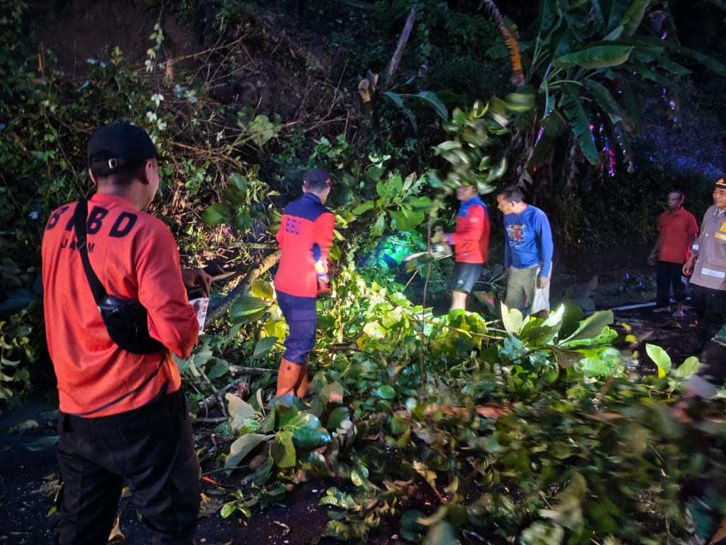 Sabtu, 17 Januari 2026. BPBD Kabupaten Trenggalek melakukan penanganan pohon tumbang yang menutup sebagian badan Jalan Nasional Trenggalek – Ponorogo KM 12 RT. 15 RW. 06 Dsn. Bubuk Desa Pucanganak Kec. Tugu kab. Trenggalek