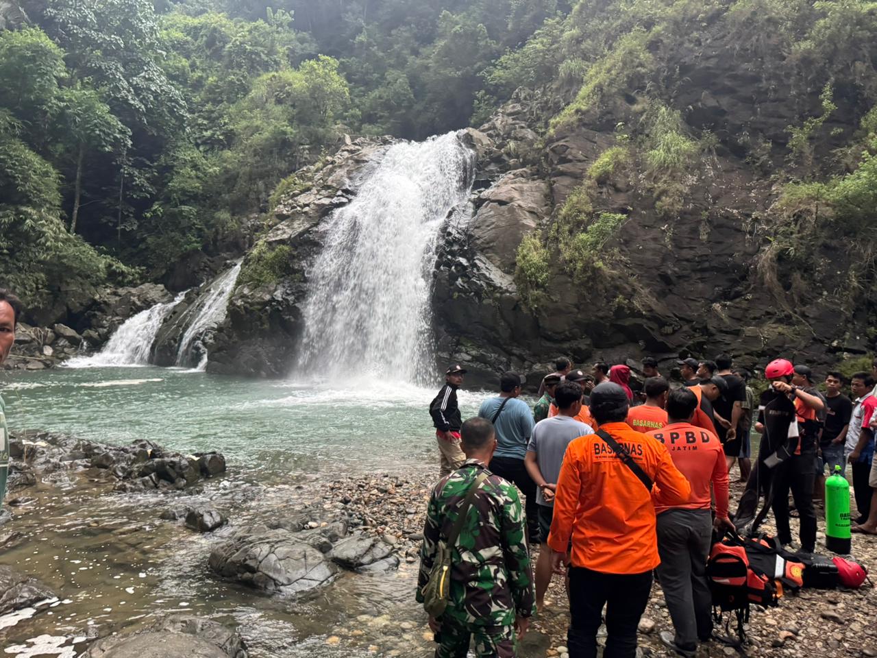 Sabtu, 2 Januari 2026. BPBD Kab. Trenggalek bersama instansi terkait melakukan pencarian korban tenggelem di Curug Manggir Kab. Trenggalek