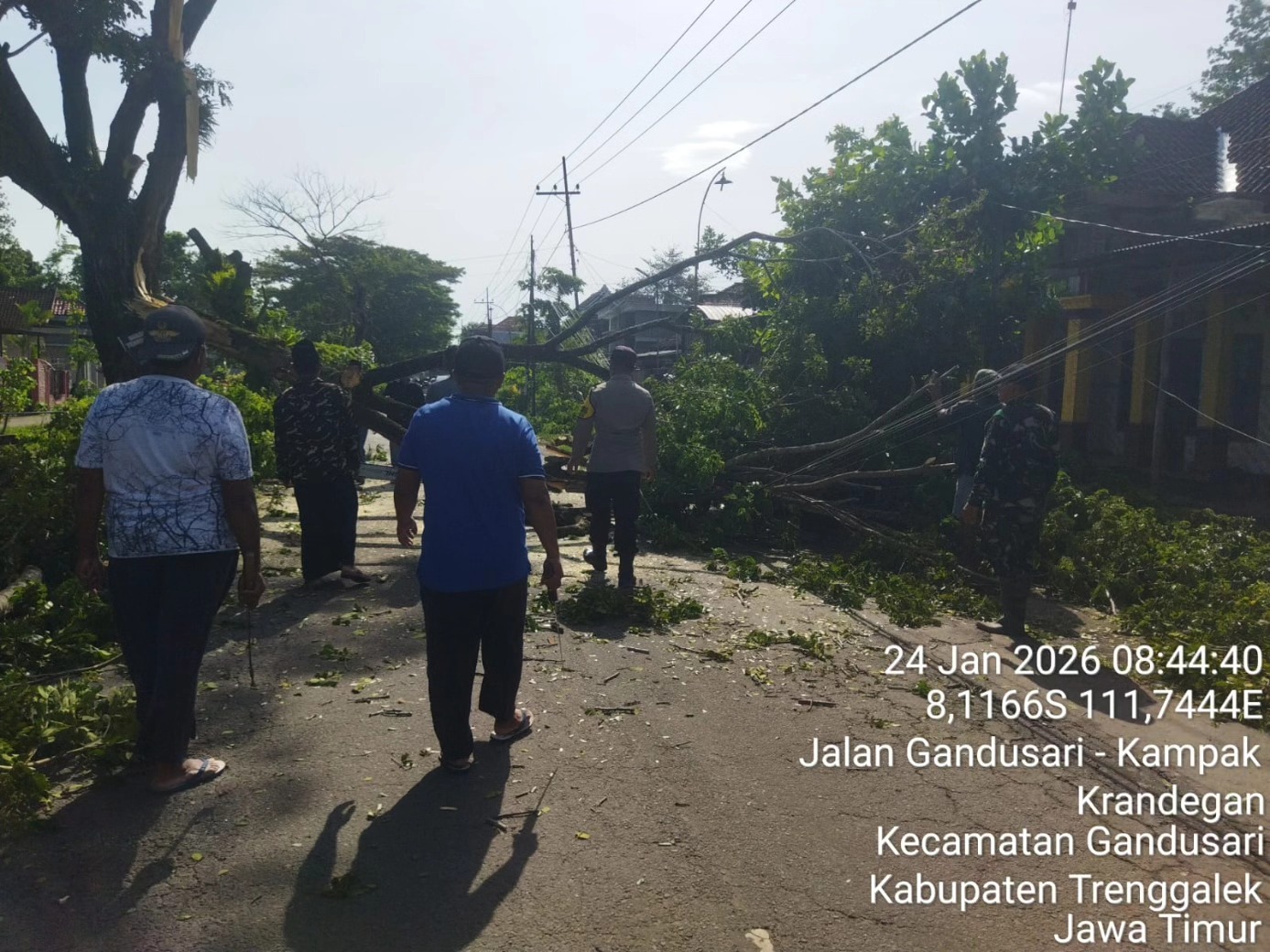 Sabtu, 24 Januari 2026 sekitar 07.30 WIB telah terjadi angin kencang sehingga terjadi pohon tumbang di Dsn. Banaran RT. 17 RW. 08 Desa Krandegan Kec. Gandusari yang melintang di Jl. Raya – Gandusari Kedunglurah.