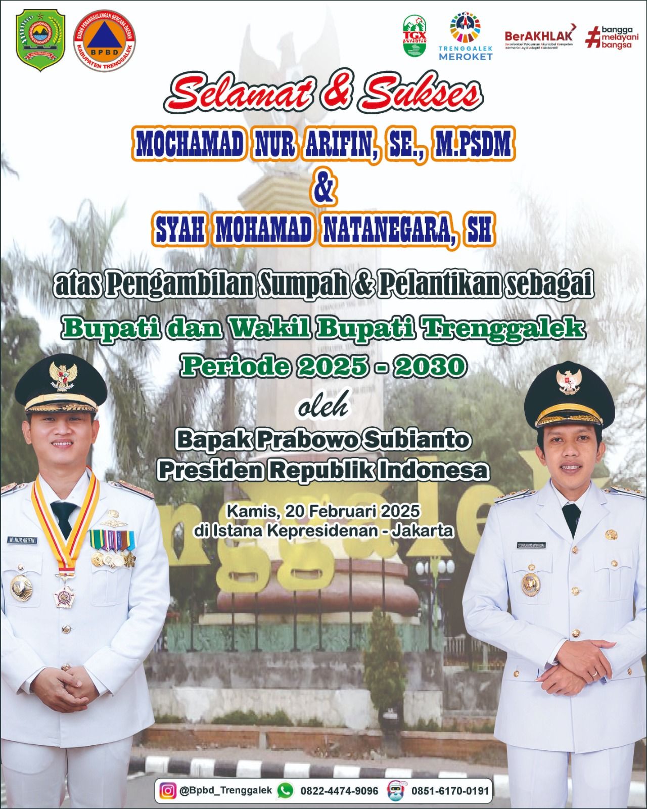 Selamat dan sukses terpilihnya Bapak Mochamad Nur Arifin, S.E., M.PSDM sebagai Bupati Trenggalek dan Bapak Syah Muhammad Nata Negara, S.H sebagai Wakil Bupati Trenggalek periode 2025 – 2030, Semoga membawa Kabupaten Trenggalek lebih maju dan meroket.