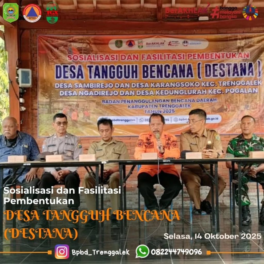 Selasa, 14 Oktober 2025 BPBD Kabupaten Trenggalek menyelenggarakan kegiatan penting bertajuk Desa Tangguh Bencana (Destana). Kegiatan ini dipusatkan di Joglo Wiroguno, Desa Sambirejo KecamatanTrenggalek, dan bertujuan untuk memperkuat kesiapsiagaan masyarakat dalam menghadapi potensi bencana di wilayah mereka. Peserta yang hadir merupakan perwakilan dari empat desa yang terletak di dua kecamatan berbeda, menunjukkan cakupan dan fokus yang terencana. Keempat desa tersebut adalah Desa Sambirejo dan Desa Karangsoko dari Kecamatan Trenggalek, serta Desa Kedunglurah dan Desa Ngadirejo dari Kecamatan Pogalan. Kehadiran perwakilan desa-desa ini diharapkan dapat menjadi pionir dalam membentuk dan mengimplementasikan program ketangguhan bencana secara mandiri di tingkat tapak.