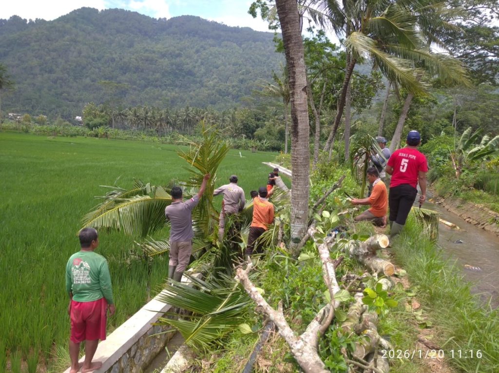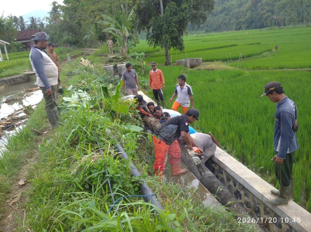 Selasa, 20 Januari 2026 Penebangan pohon bersama PUPR Bina Marga dan SDA untuk pengamanan saluran irigasi lahan persawahan kecamatan panggul di Ds. Barang dan Ds. Bodag