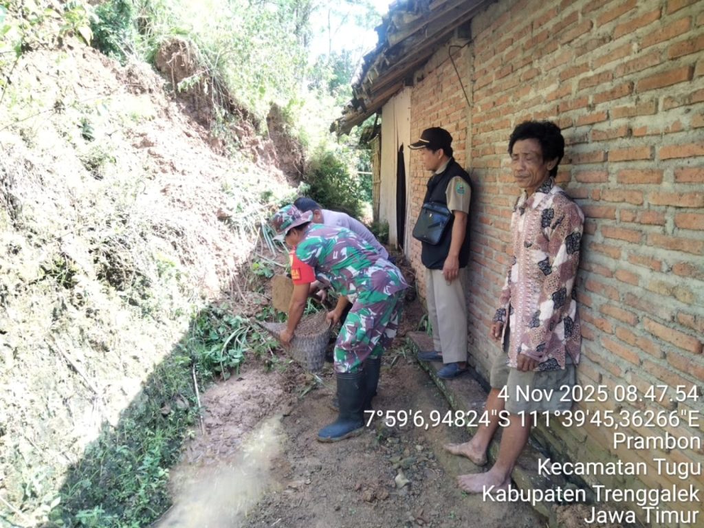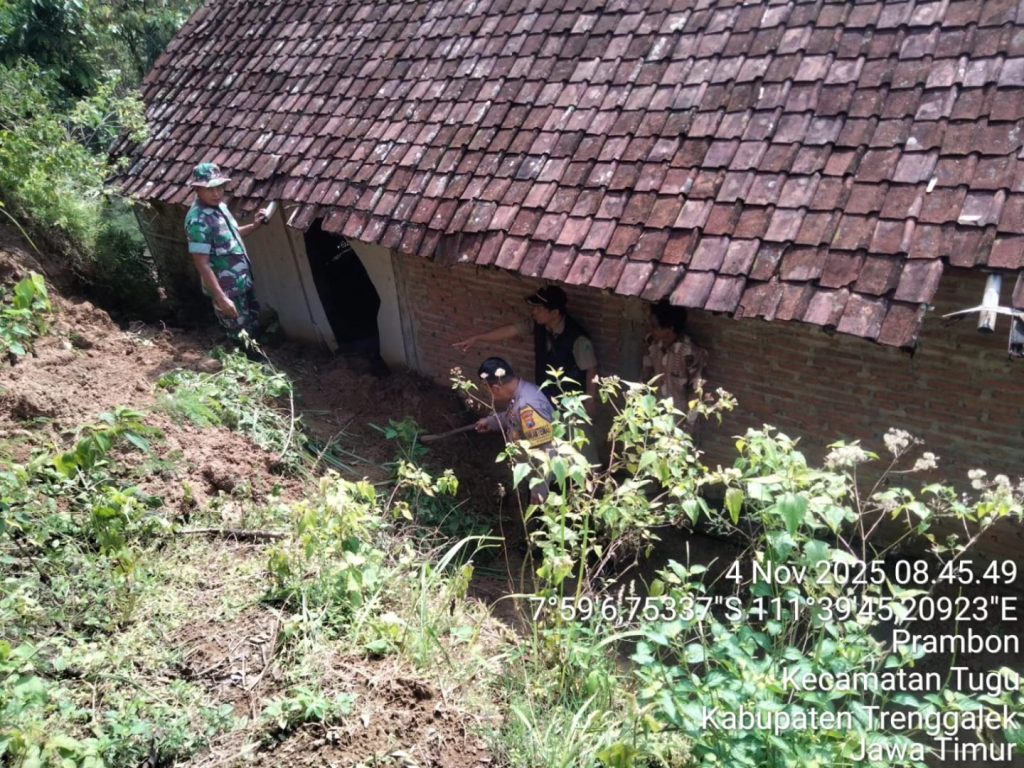 Hari Senin Tanggal 03 Nopember 2025 mulai Pukul 12.00 s/d Pukul 13.45 WIB di Wilayah Kec. Tugu diguyur hujan dengan intensitas tinggi dan sekitar Pukul 16.30 WIB terjadi Tanah longsor di RT 56 RW. 12 Dsn. Mloko Ds. Prambon Kec. Tugu yang mengakibatkan tebing longsor dengan tinggi -+6 m, panjang -+8 m dan lebar -+4 m yang mengenai dinding dapur rumah Bapak Rusni hingga jebol.
