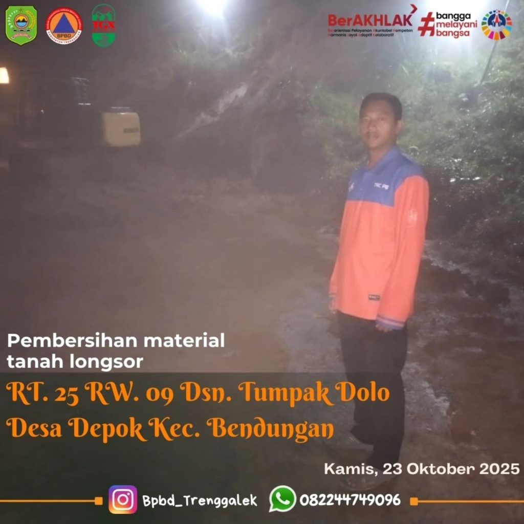 Update penanganan tanah longsor Jalan Trenggalek – Tulungagung via Kecamatan Bendungan tepatnya di RT 25 RW 09 Dsn. Tumpak Dolo Ds. Depok Kec. Bendungan yang terjadi pada hari Rabu sekitar pukul 16.00 WIB, Hari ini Kamis 23 Oktober 2025 sekitar pukul 06.00 WIB jalur sudah bisa di lewati, pasca hujan deras yang mengguyur wilayah kecamatan Bendungan yang mengakibatkan tanah longsor sehingga menutup badan jalan BPBD Kab. Trenggalek berkoordinasi dengan pihak terkait melaksanakan percepatan penanganan menggunakan alat berat Dinas PUPR di bantu penyemprotan jalan menggunakan tangki penampung susu, alat berat tiba di lokasi kejadian sekitar pukul 03.00 WIB Langsung melaksanakan pembersihan. Terlibat dalam giat TRC – PB Muli Sektor BPBD, TNI, POLRI, Dinas PUPR, Muspika Kec. Bendungan, Perhutani, Pengusaha pengolahan susu dan warga. Pukul 06.00 WIB penanganan selesai jalan bisa kembali di lalui.
